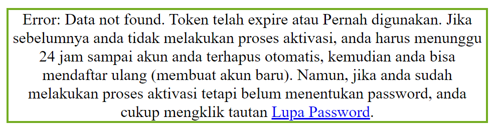 Kembali ke Beranda Jawaban. Jika anda menerima kode seperti gambar di bawah ini, itu menandakan token tersebut pernah digunakan, itu artinya akun anda sudah aktif, tidak perlu lagi melakukan aktifasi, karena halaman tautan aktifasi yang diterima pernah dikunjungi satu kali. Namun bisa dipastikan anda belum sempat membuat password baru karena password baru dibuat ketika berhasil melakukan aktifasi. Jadi pada situasi ini, anda berhasil aktifasi namun tidak berhasil membuat password.